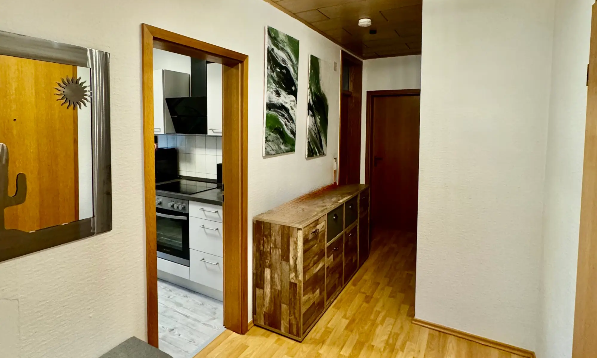 Der Flur bietet zusätzlichen Stauraum und verbindet alle Räume sinnvoll miteinander. Die Wohnung befindet sich insgesamt in einem gepflegten Zustand.