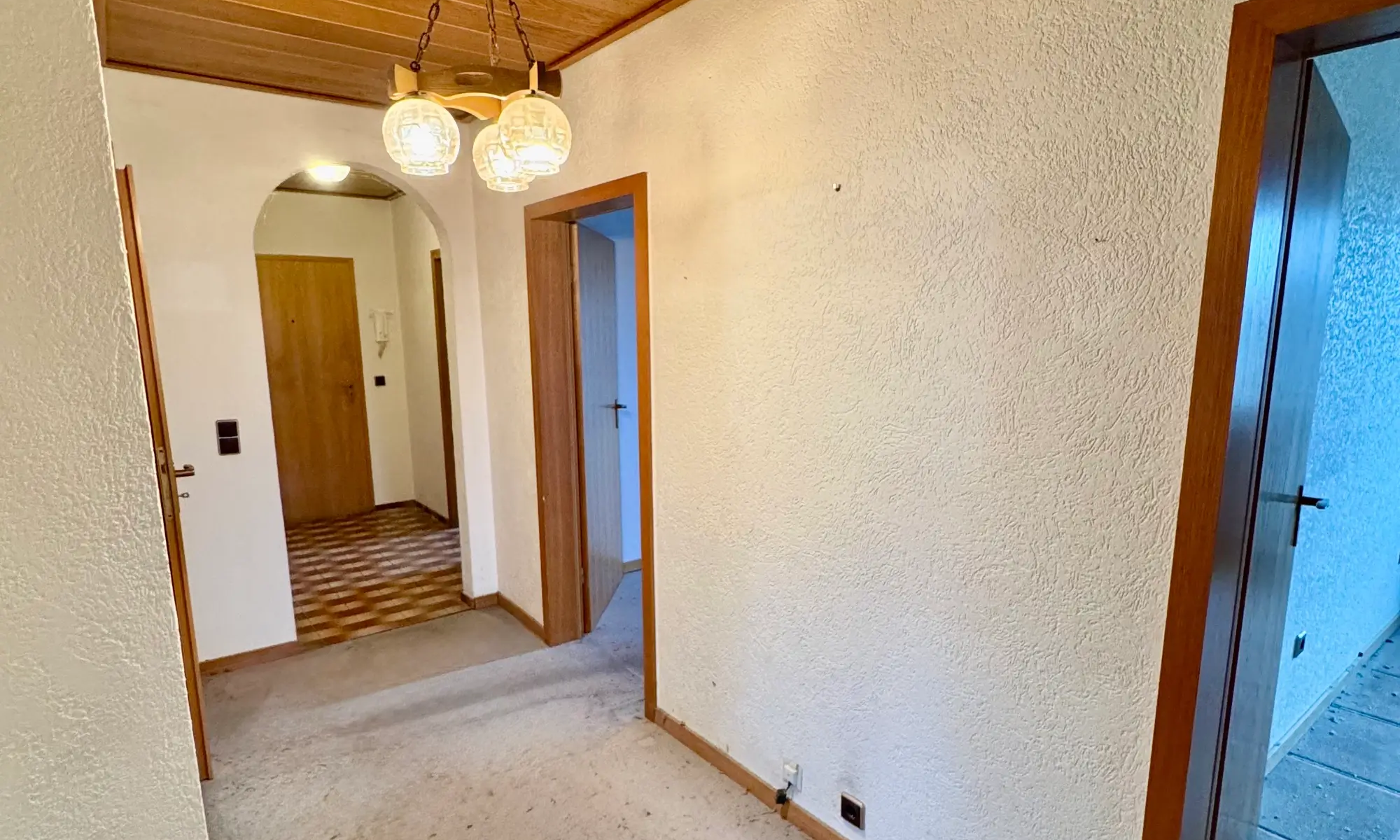 Der Flur verbindet alle Räume sinnvoll miteinander und bietet Platz für Garderobe sowie weitere Stauraumlösungen. Die vorhandene Ausstattung entspricht überwiegend dem Baujahr und stellt eine solide Basis für individuelle Modernisierungsmaßnahmen dar.